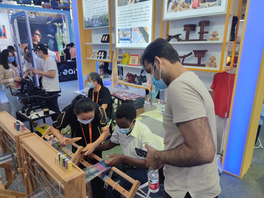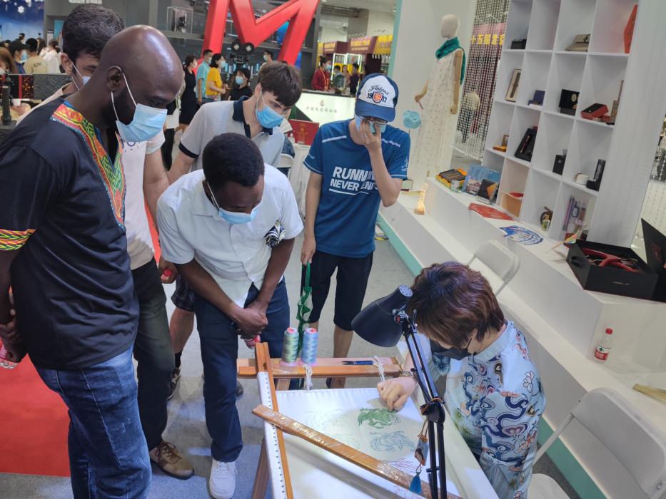 参与师生首先参观了教育服务展览,了解新时代国际教育发展趋势,并与其他高校国际学生沟通交流。随后依次参观学习了文化服务、建筑服务等主题展览。在文化服务展览馆中,国际学生观摩了刺绣、书法、泥人等,并在老师的指导下体验了中国传统纺织工艺。