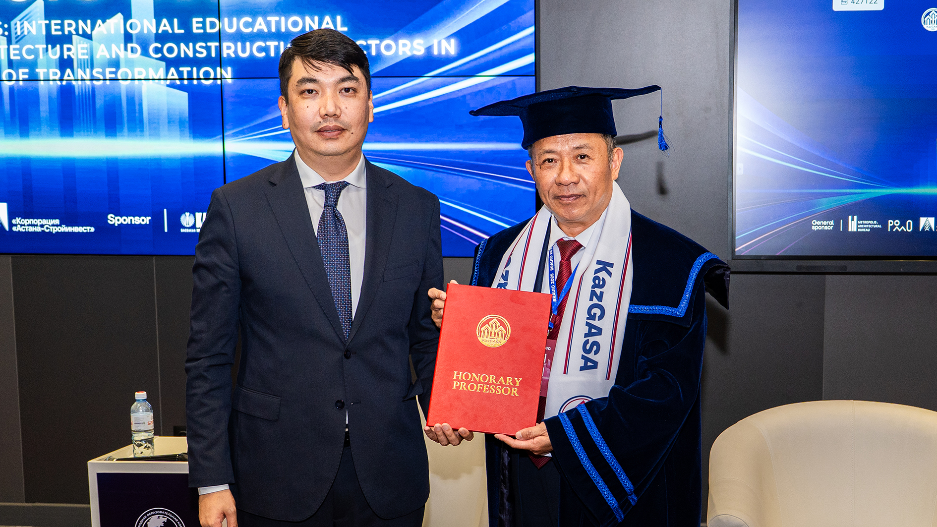 与哈萨克斯坦国际教育集团战略伙伴关系中的关键作用,哈方举行仪式,授予张大玉校长哈萨克斯坦建筑与土木工程学院“荣誉教授”称号。