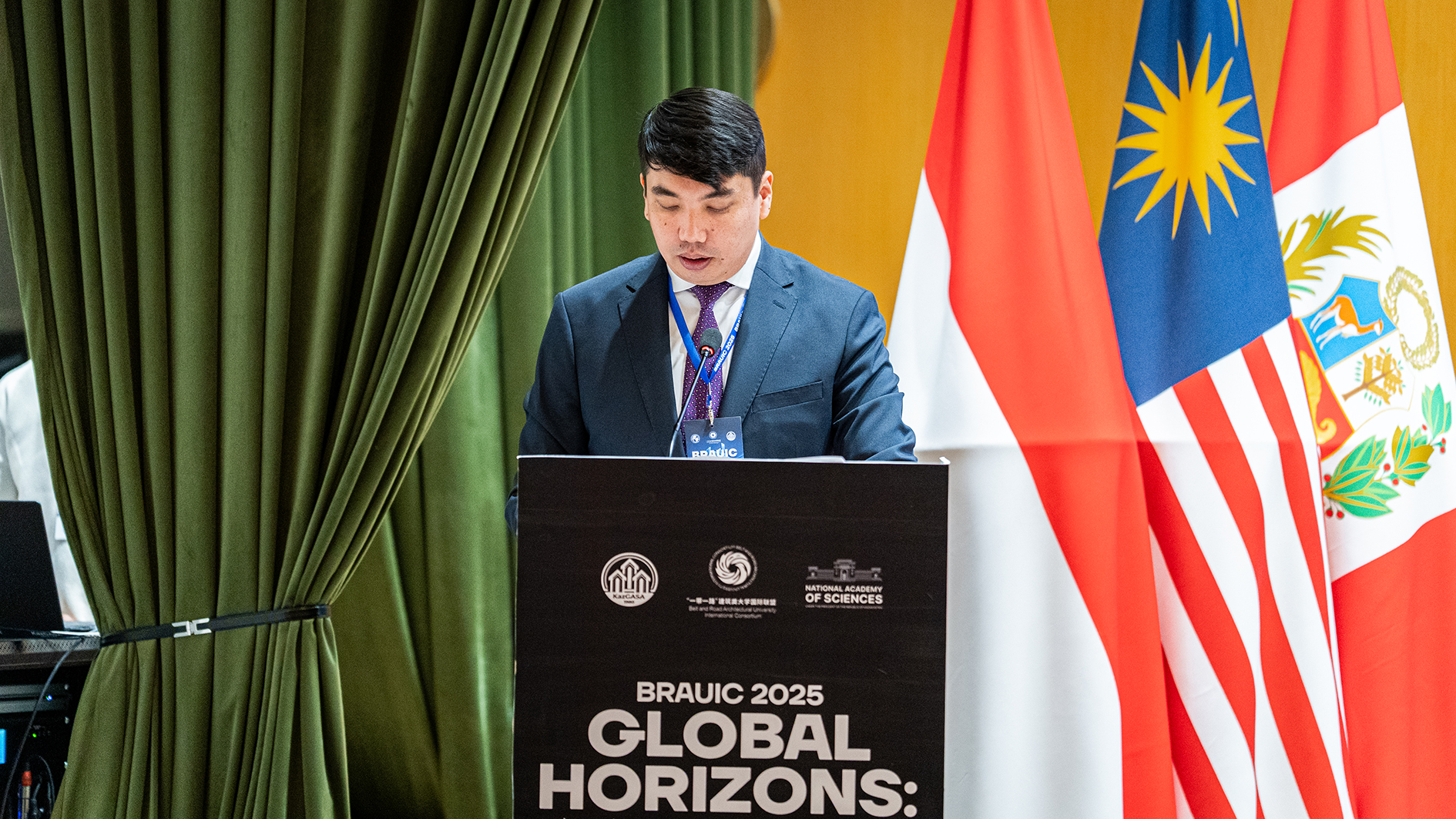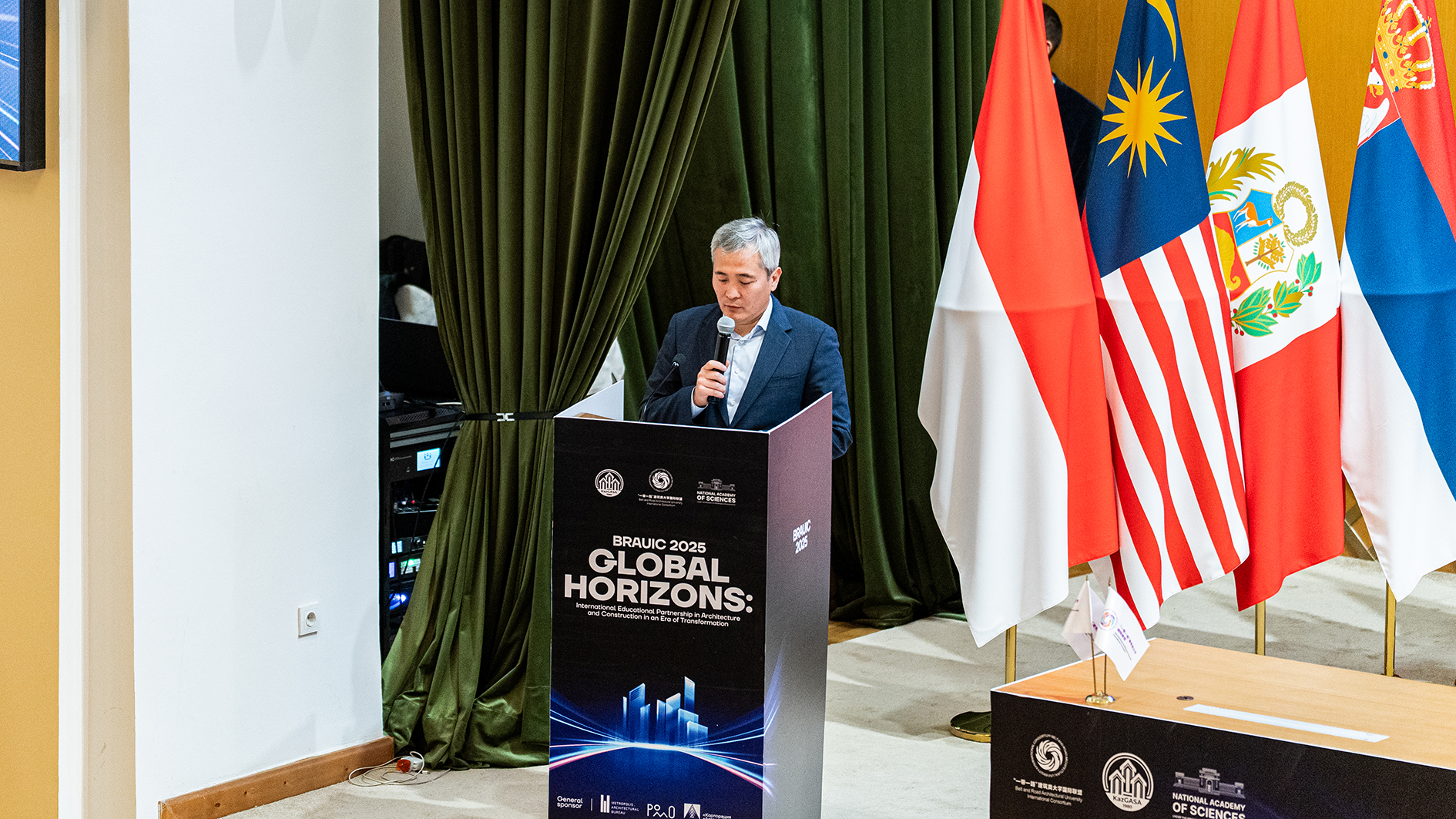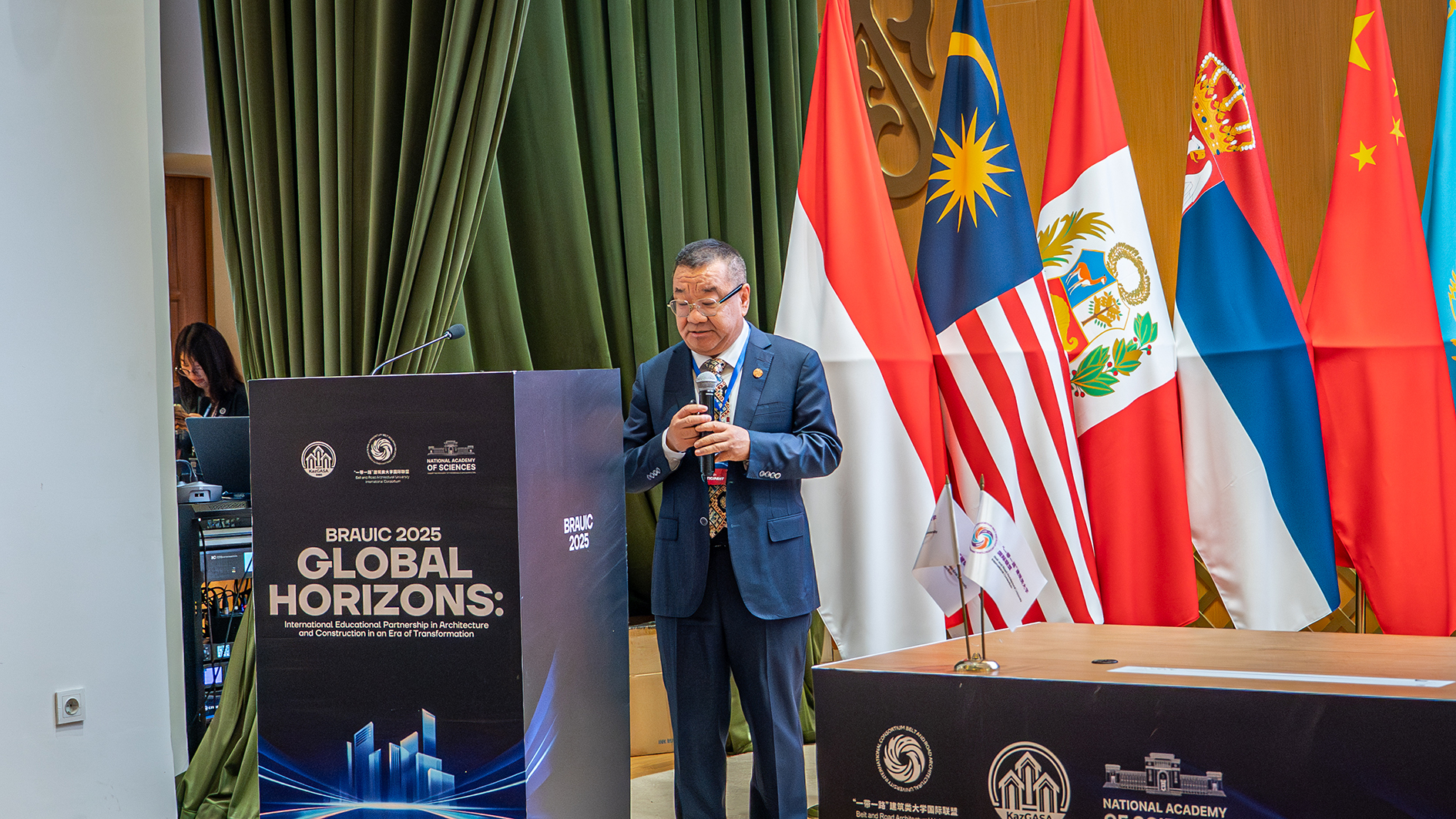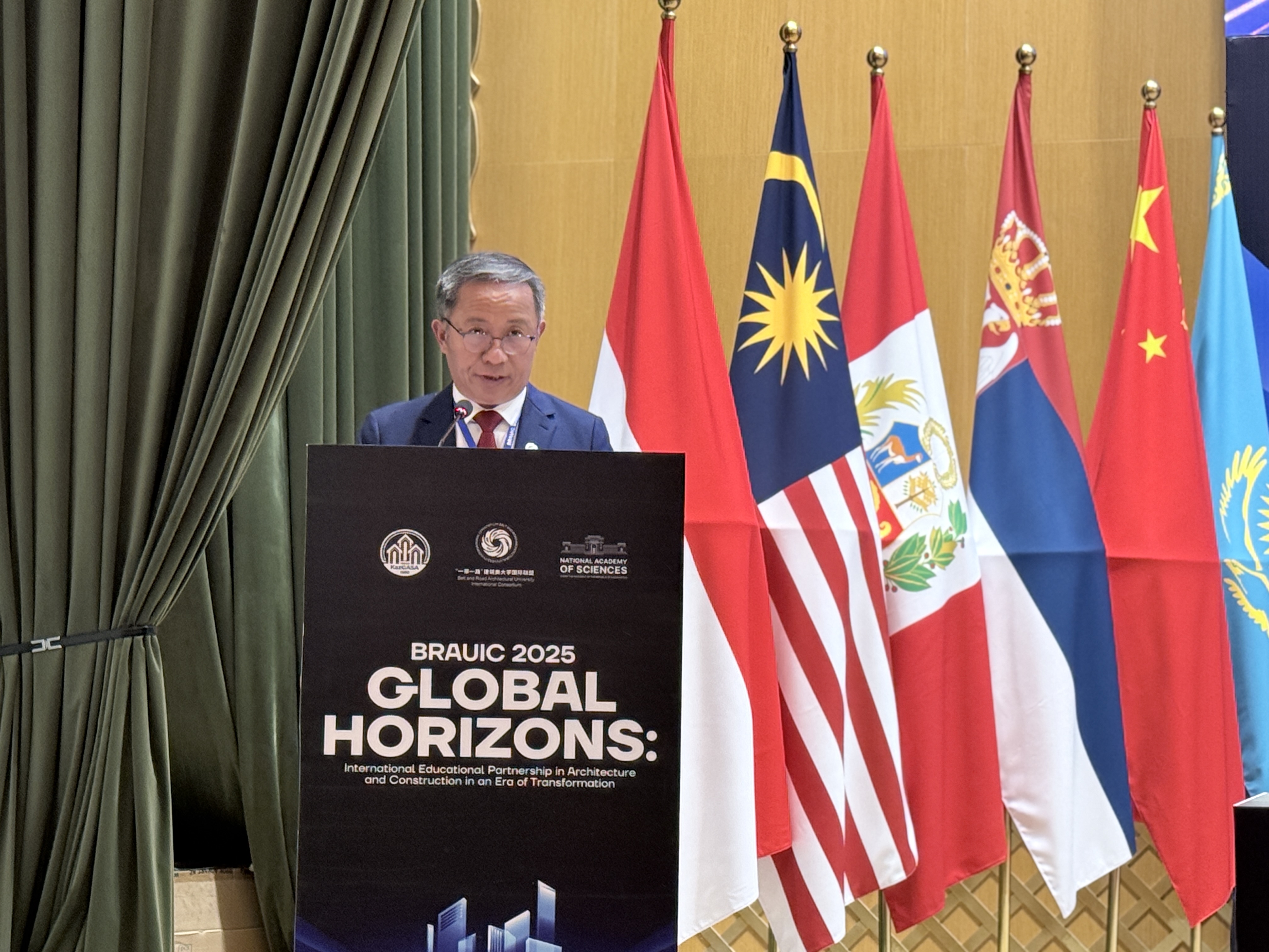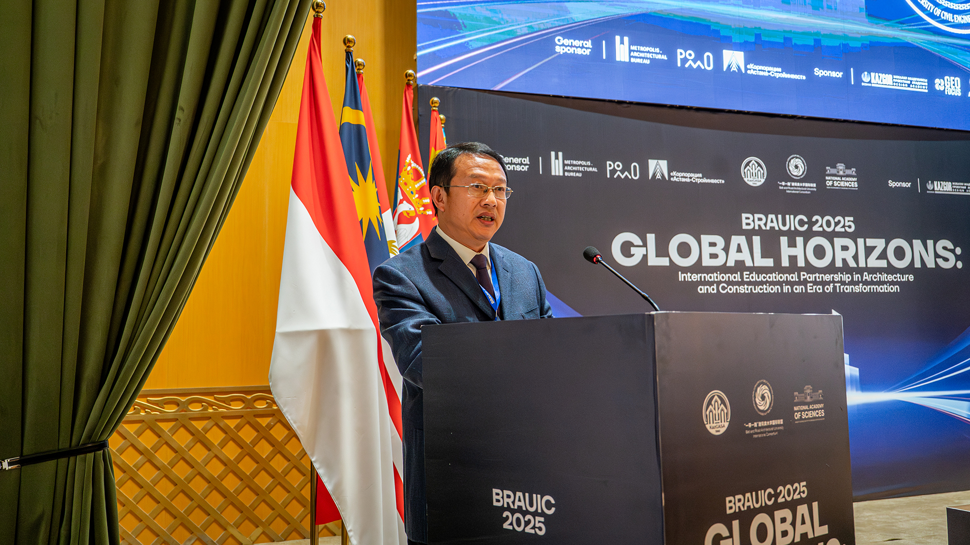 及所有与会嘉宾表示热烈欢迎和衷心感谢。他指出,本次论坛对哈萨克斯坦建筑行业与国际合作具有里程碑意义,为各国高校、企业与政府管理部门搭建了宝贵的交流平台。他强调,在绿色转型与新时代发展的背景下,论坛不仅是信息交汇的枢纽,更是推动未来科研合作与校企协同的重要契机。他特别向哈萨克斯坦共和国国家科学院、科学和高等教育部等支持单位致谢,并期待各方以此为契机,建立更紧密的长期合作关系,共同推动建筑领域创新与可持续发展。