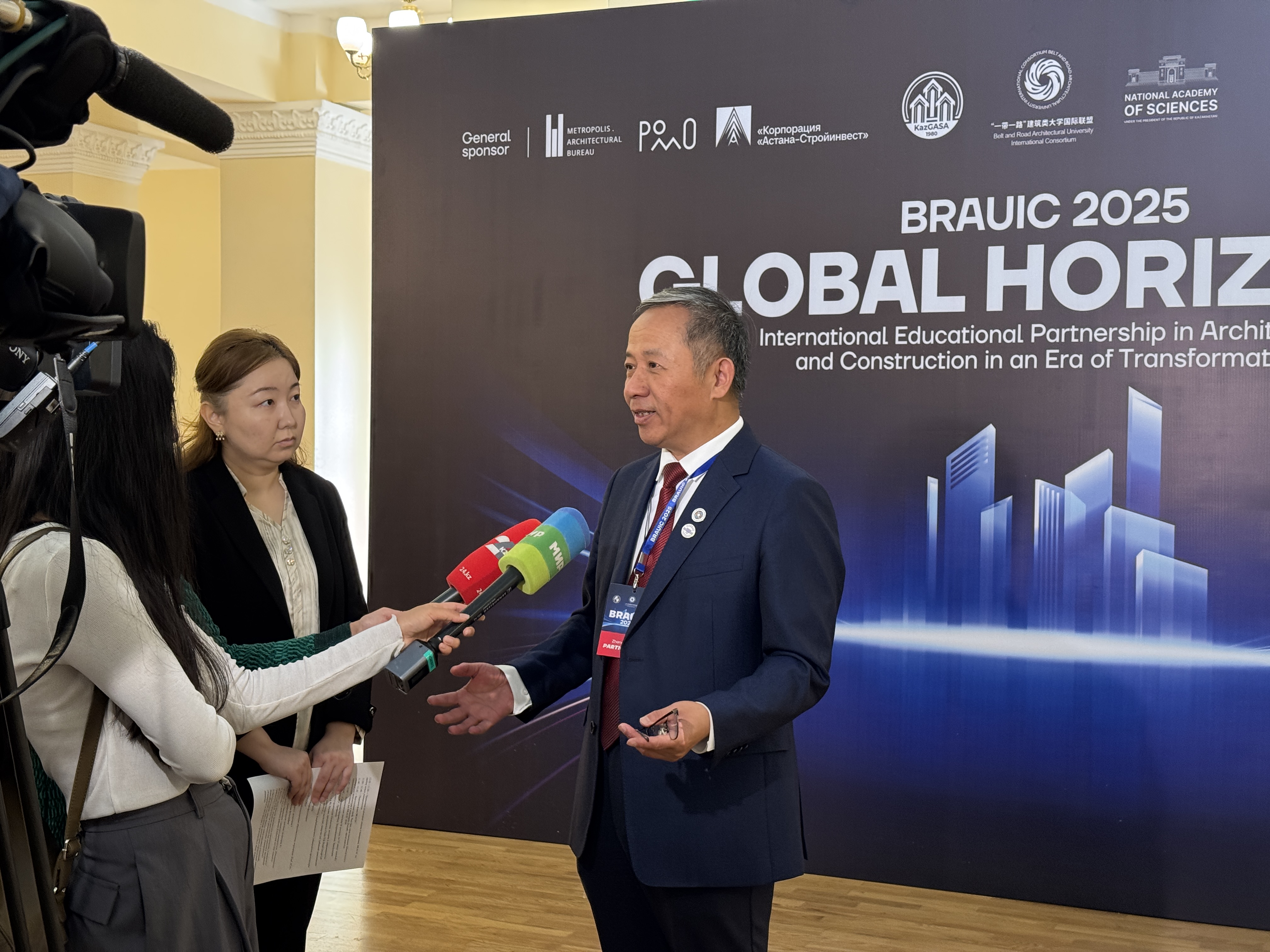 会前,张大玉接受了哈萨克斯坦世界电视台、哈萨克斯坦24KZ电视台等当地媒体采访,介绍了联盟成立九年来的扎实成果和合作经验,期待未来能与哈萨克斯坦及各国伙伴进一步深化合作,共同培养高素质建筑人才,为全球可持续发展注入新动力。